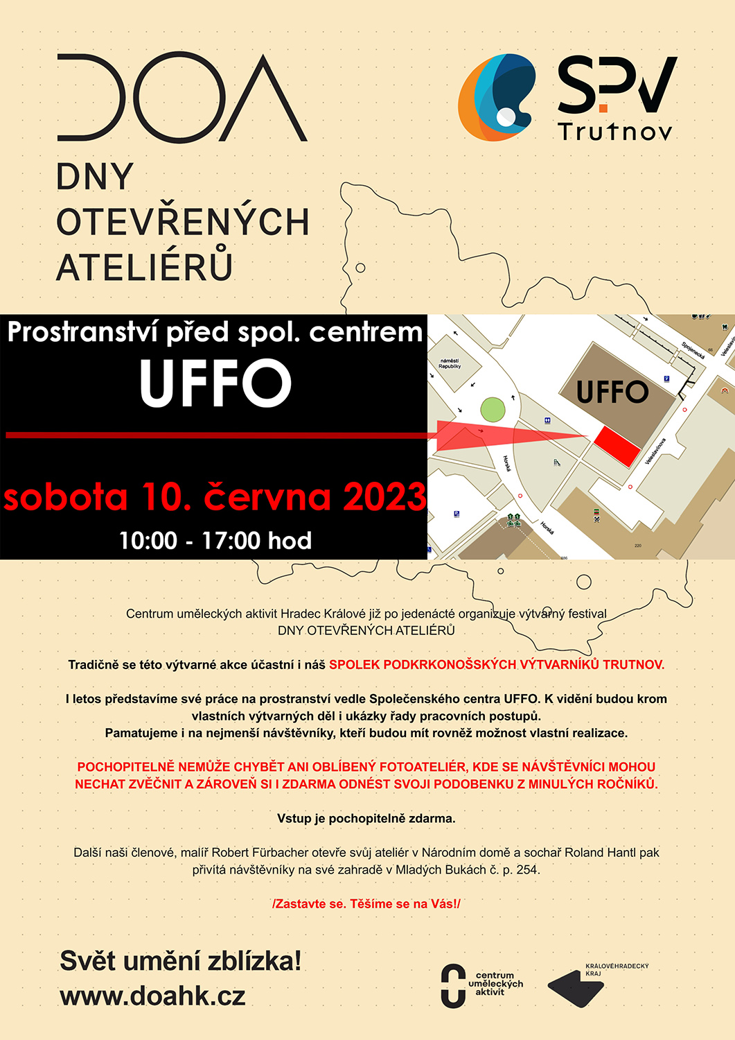 • Spolek podkrkonošských výtvarníků Trutnov,  prostor u Společenského centra UFFO v Trutnově (za lékárnou), nám. Republiky, s programem malba, fotografie, dřevořezba, technika paličkování a další (sobota, 10-17)