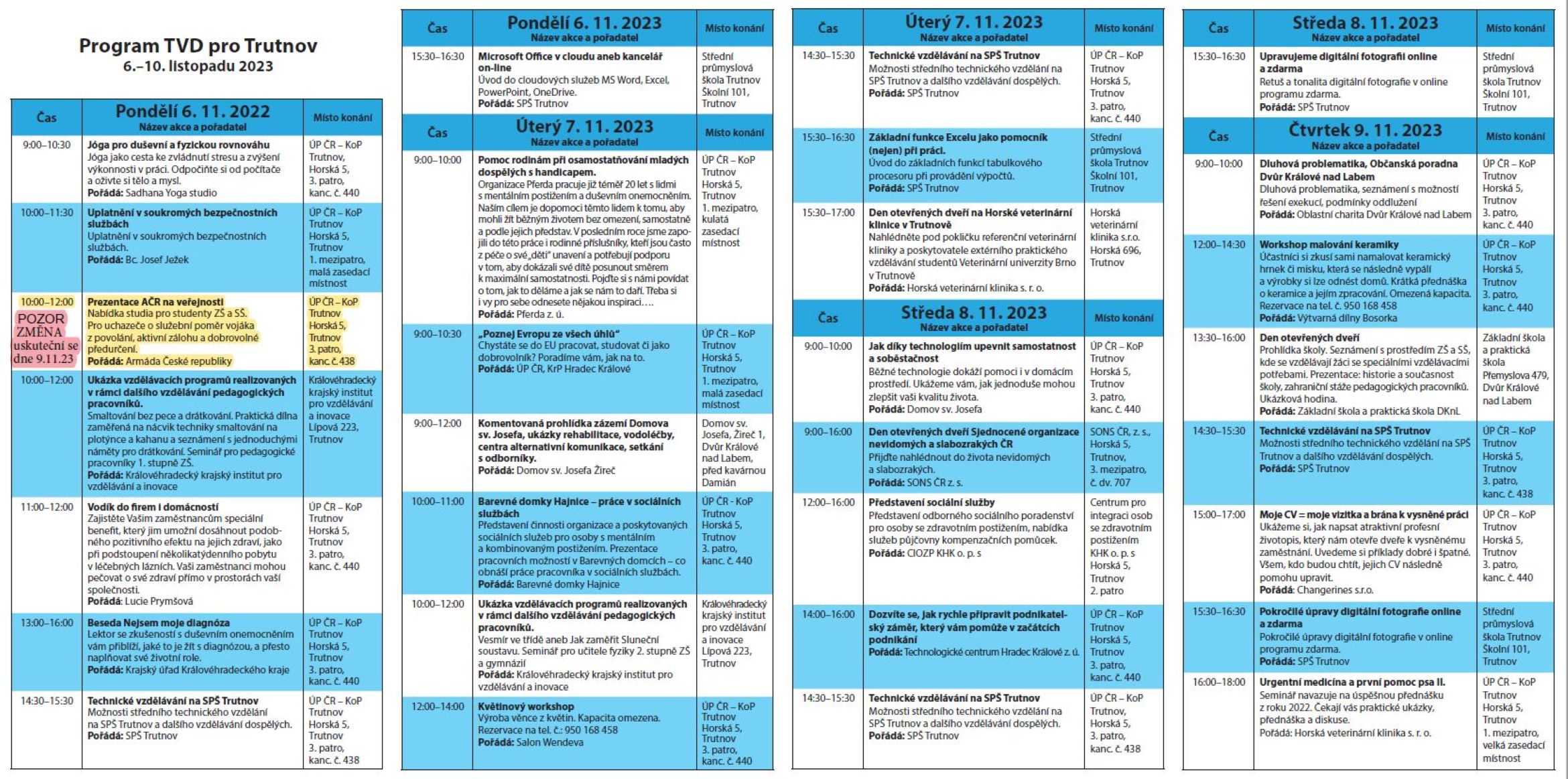 Akce se konají v řadě trutnovských organizacích. Podrobný program v tištěné podobě dostanete v našem Infocentru.